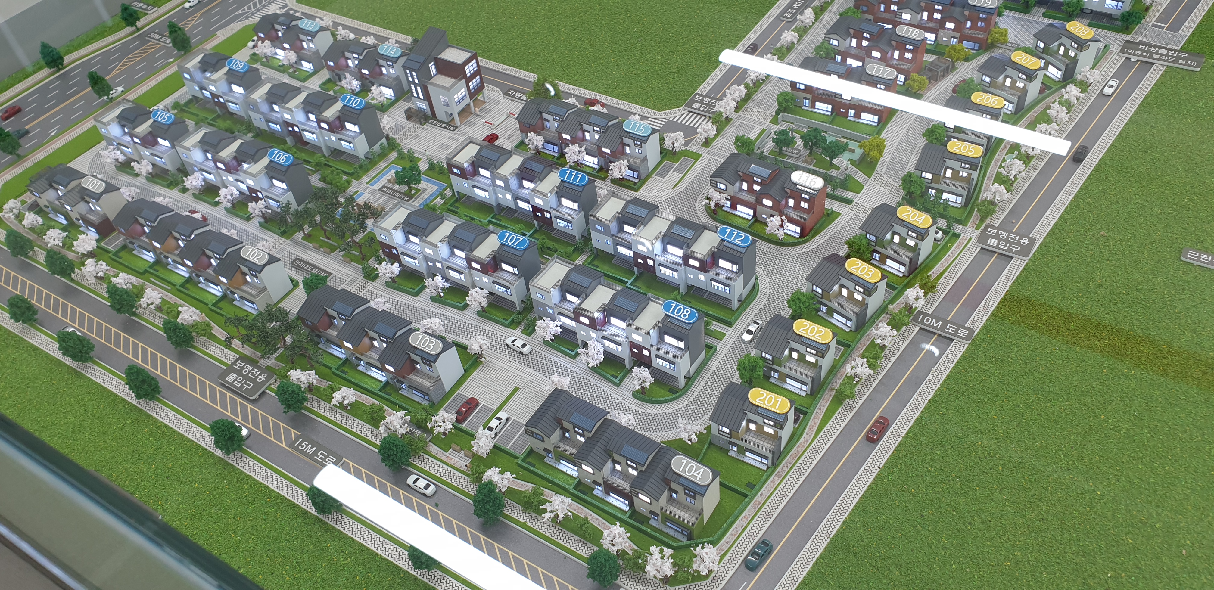 복층형으로 구성된 세대가 단지를 이루어 있는 모습이에요.